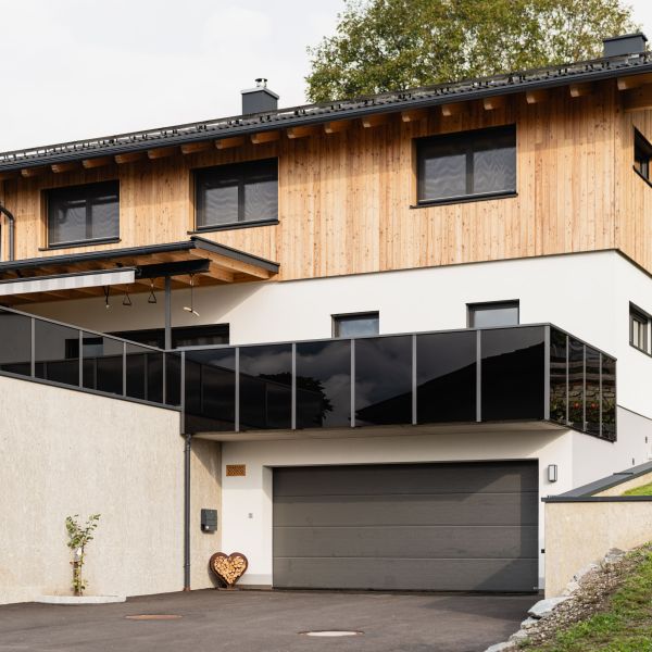 Holzhaus mit ökologischer und folienfreier StockerRiegelwand und Pultdachstuhl.